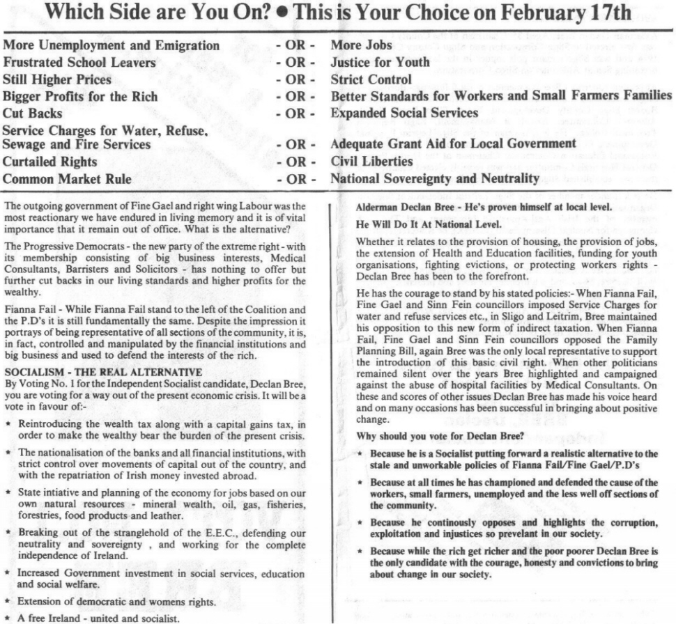 Declan Bree of the Sligo/Leitrim Independent Socialist Organisation from 1987. Long before he joined (and left) the Labour Party. In this 1987 Election Bree polled 2,584 votes and failed to win a seat.