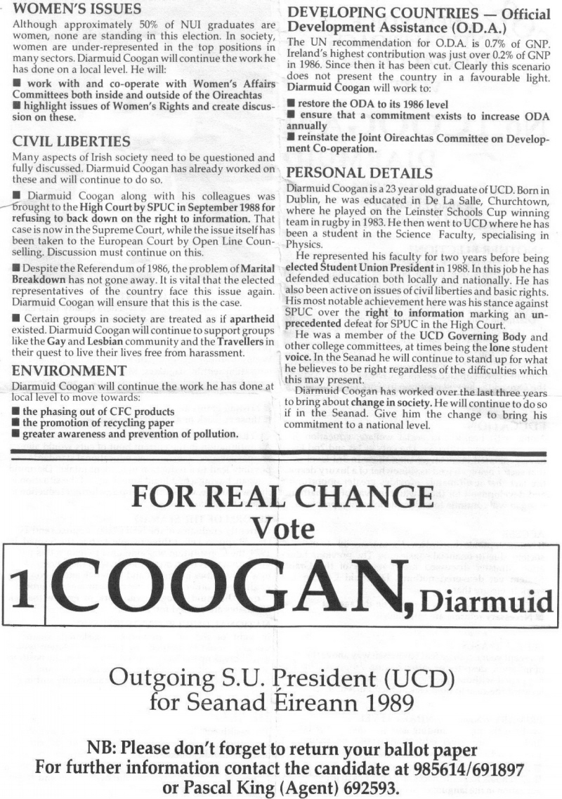 Leaflet from Diarmuid Coogan- NUI Seanad 1989 » cooganb89a