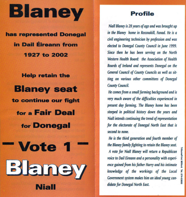 Harry retired in 2002 and it was his son Niall Blaney who successfully stood for Independent Fianna Fail. The third generation of Blaneys to be elected to the Dail.