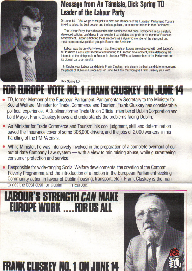 Former Leader of the Labour Party Frank Cluskeys literature from the 1984 Euro Elections. In 1991 after losing his Dail seat (and the leadership of Labour) Frank had been co-opted to the European Parliament, to replace Michael O’Leary (who replaced him as leader of the Labour Party) . O’Leary resigned as Party Leader just over a year later (and joined Fine Gael) and was replaced by Dick Spring. Cluskey resigned from government in 1983 over a point of principle regarding Dublin Gas.