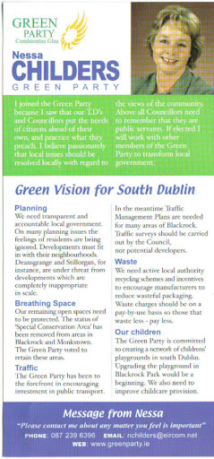 Nessa, daughter of former President Erskine Childers won a seat for the Green Party here. She later resigned the seat and bowed out of politics only to reappear as Labour candidate for Ireland East in the 2009 Euro elections.