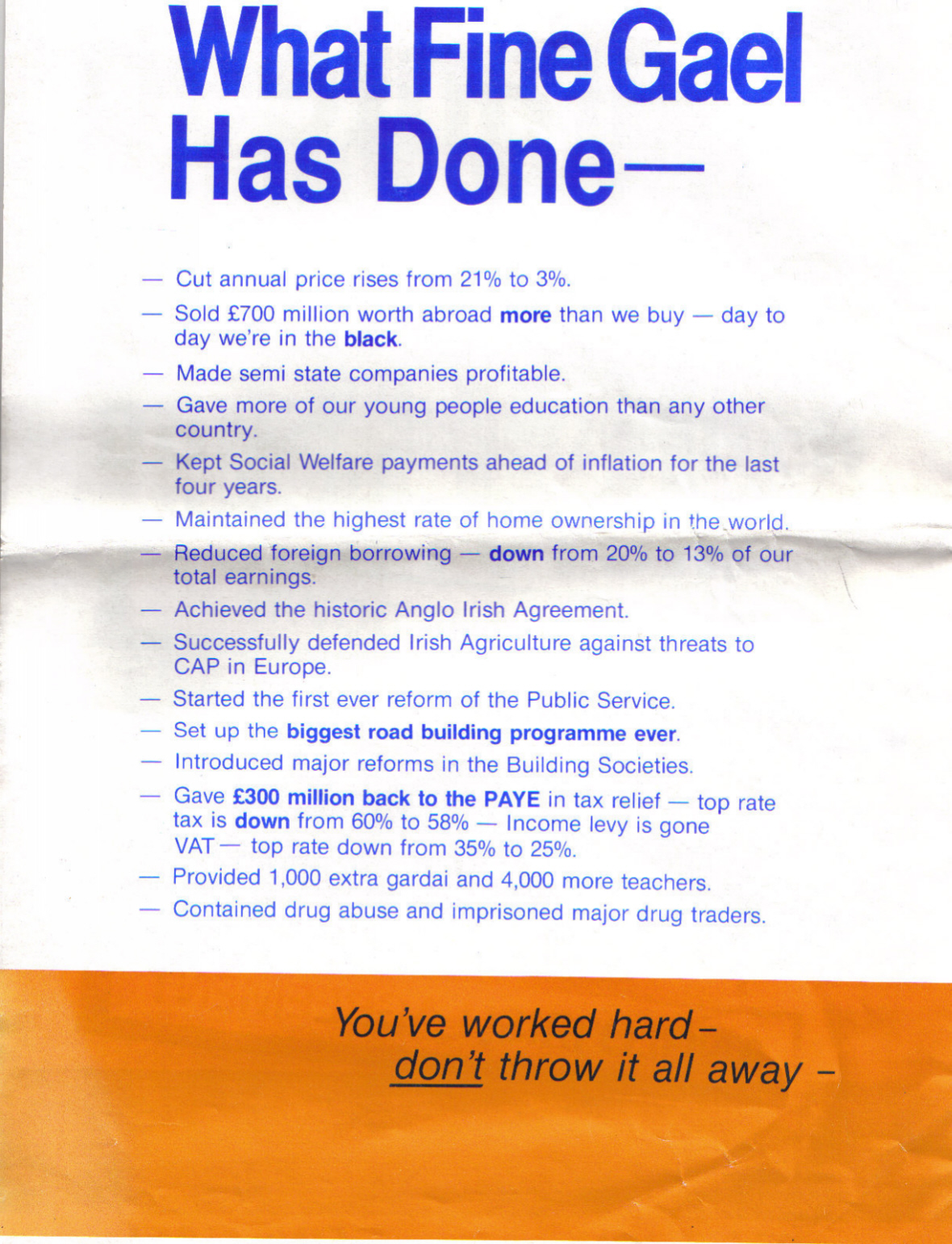 the time ‘Guaranteed Irish’. They had inherited a country in bits and some of the text such as “You’ve worked hard- don’t throw it all away” gives an idea of the sacrifices the public (or the PAYE sector) were making. Mind you there was still an awful long way to go….