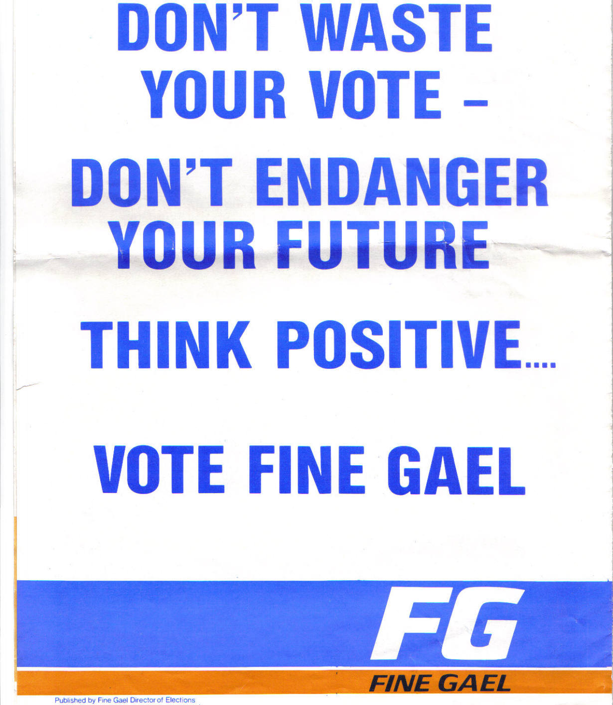 Election 87 after five years in Government Fine Gael play on the highly popular (and important) slogan of