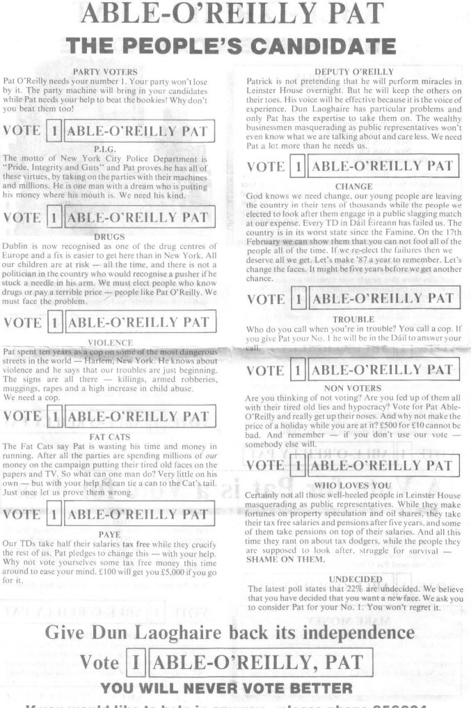 Slightly Bizarre… Pat ‘Abel’ O’Reilly- “You will never Vote Better” -1987 Dun Laoghaire » abelor2a