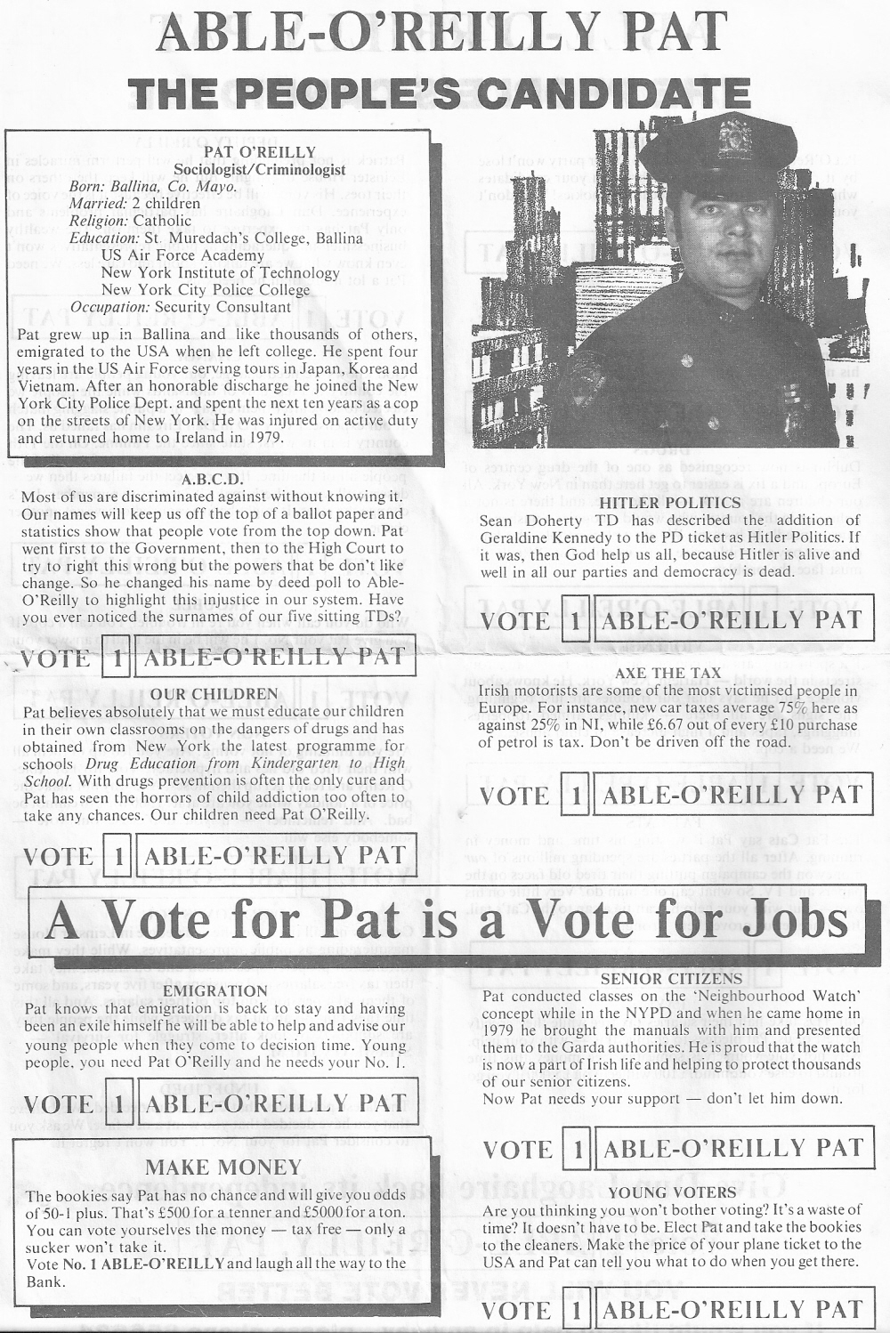 Slightly Bizarre… Pat ‘Abel’ O’Reilly- “You will never Vote Better” -1987 Dun Laoghaire » pabel87a