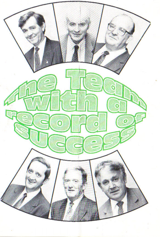 From the 1991 Local Elections in Athlone. Fianna Fail candidates PJ Coghill, Sean Fallon, George Ledwith, Kieran Molloy, Egbert Moran and Cieran Temple. A strange layout of the candidates in this leaflet. Its unusual that there are no names beside the candidates pictures.I’d hazard there haven’t been too many ‘Egberts’ put before the electorate either.