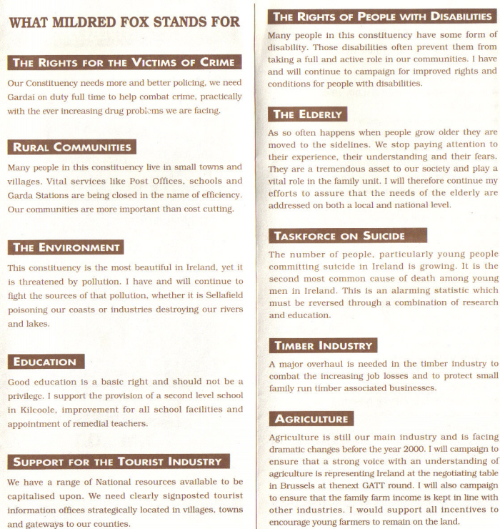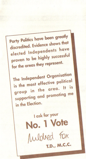 Mildred Fox an Independent TD for Wicklow, was first elected in 1995 in a By Election caused by the death of her father Johnny Fox. Johnny Fox was a Fianna Fail Councillor who ran as an Independent candidate in the 1992 General Election , having failed to get a nomination from Fianna Fail.