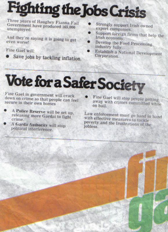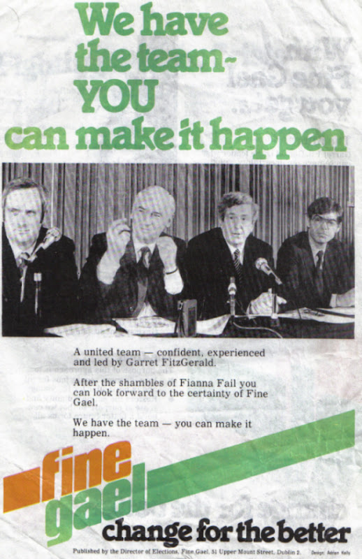 Fine Gael in November 1982. Garret Fitzgerald is used prominently. Note the reference to “after the Shambles of Fianna Fail”. Most elections up until the late 90s FF would have campaigned on the benefits and stability of single party government. This was a good dig at that. The outgoing Fianna Fail government had had all sorts of scandals as well as the usual internal dissent over Haugheys leadership.