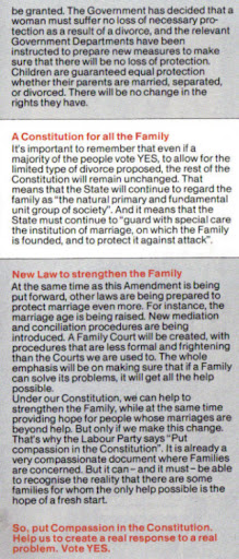 This is from the 1986 Divorce Referendum. The Yes side had the simple argument of recognising when a marriage had broken down and giving people a second chance. The No side had legal, moral and other arguements against. As Far as I’m aware Fine Gael whilst in favour of the referendum didn’t officially campaign. Labour were the only major party advocating a Yes vote.