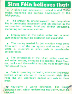A boyish Aengus in his first General election outing in 1987. This Leaflet has the Sinn Fein Policies at the back and also included the standard 1987 Sinn Fein Literature with a profile of Aengus.