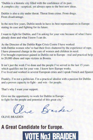 Olive Braiden was a surprise choice to many as one of Fianna Fails 3 candidates in Dublin 1994. Widely known for her work with the Rape Crisis Centre she failed in her attempt for election.