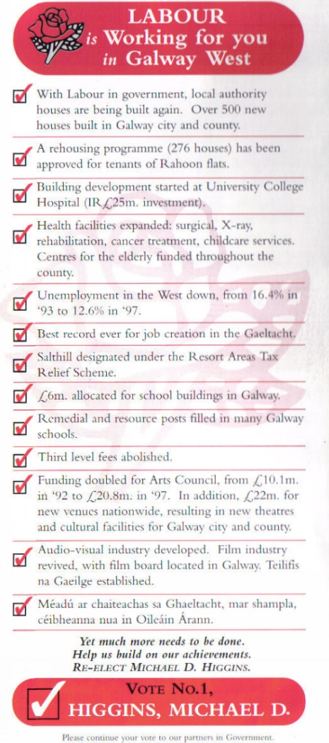 From the 1997 General Election a leaflet from Michael D. Higgins running for Labour in Galway West. The leaflet sings the praise of the Rainbow and lists their achievements in Galway.
