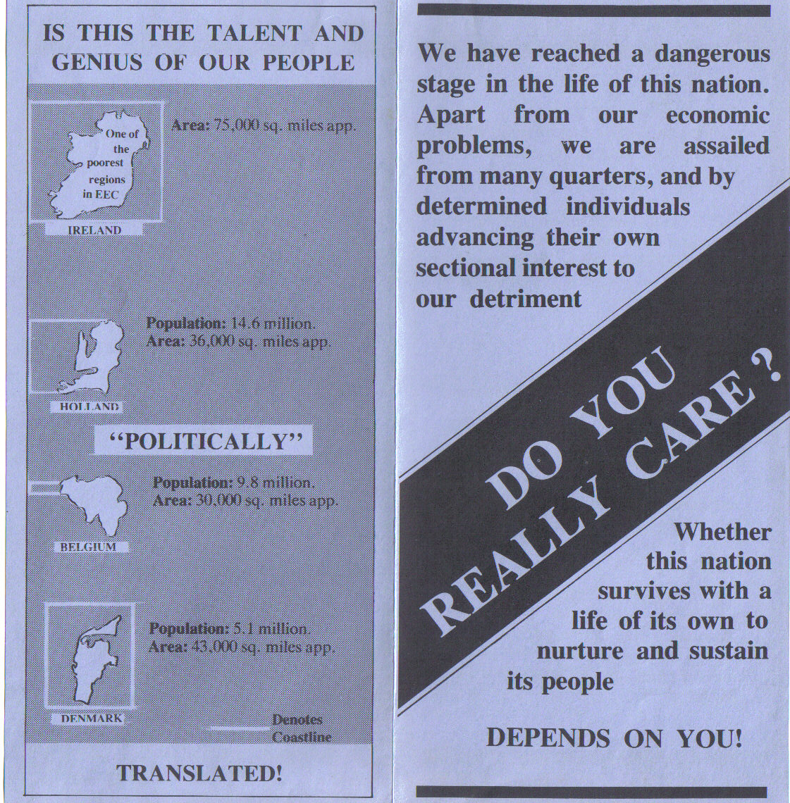 I just like the design of these two leaflets, the mother carrying her shopping with a boy and girl either side, the warm greeting ‘Dia bhur mbeatha’ and even the colurs are unusual for election flyers.