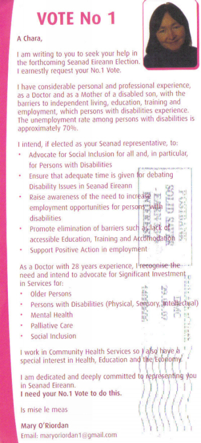 The leaflet of  Mary O’Riordan,  sister of John O’Donoghue, in her bid for the Seanad in 2007.