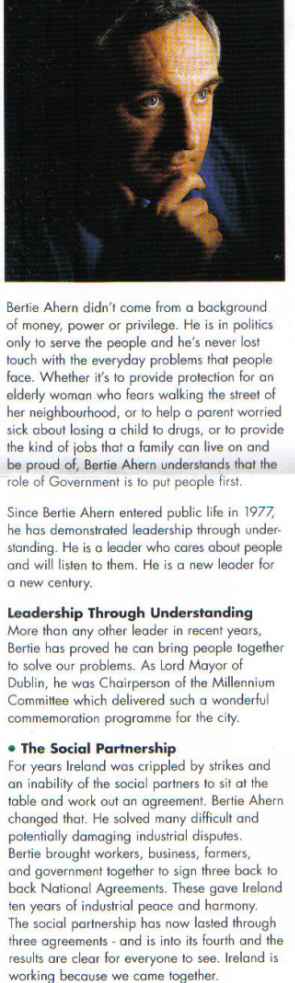 “A Young Leader for a Young Country” who on the inside of this doc is  “A New Leader for a New Century”. The profile of Bertie “.. he is in politics only to serve the people” and other plaudits that in hindsight ring hollow.