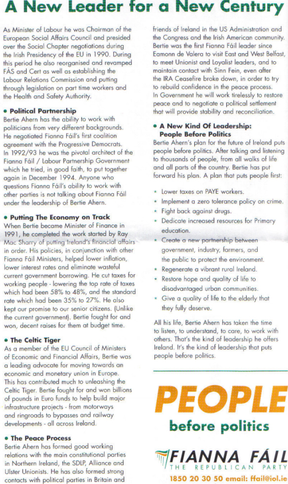 This was one of a series of leaflets for the 1997 election produced by Fianna Fail. Some were on Crime, some on Drugs, some on Job creation and so on. The fact that there was a whole leaflet dedicated to their leader shows how much they played on ordinary Bertie who is in touch with the people. He was that important to them.