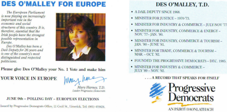 1994 Euro Elections Munster constituency. A split in the PDs led to Pat Cox standing as an Independent and Des O’Malley standing for the PDs . Cox despite being behind O’Malley on the first count took the last seat.