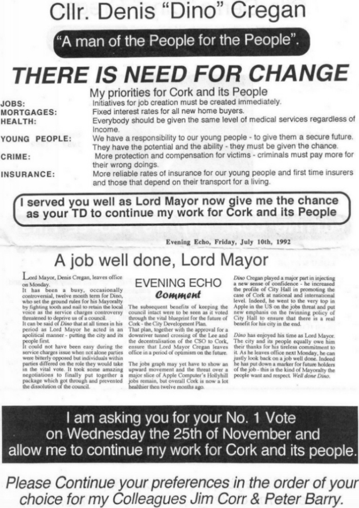 Denis ‘Dino’ Cregan from the 1992 General Election in Cork South Central. Dino is another ‘Man of the people’, this time though ‘a man of the people for the people’. Dino evidently did a great job as Lord Mayor (and possibly has friends in the Evening Echo) and according to himself did a great job in the Seanad. Still he failed to win the seat.