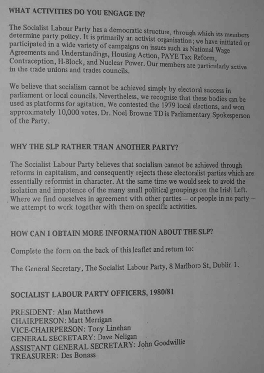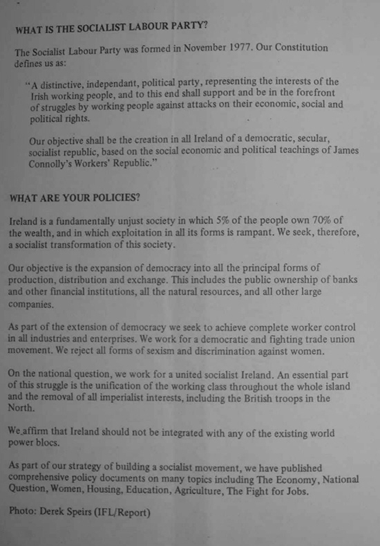 1. […] posted a Socialist Labour Party Recruitment Leaflet circa 1980. May be of interest to some.. Socialist Labour Party- Recruitment Leaflet Irish Election Literature Blog __________________ . To view links or images in signatures your post count must be 10 or greater. […]