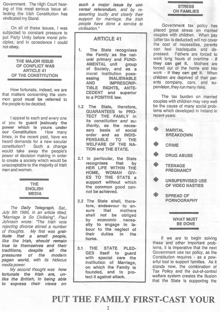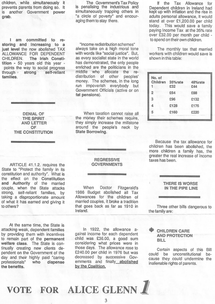 The now Independent TD, Alice Glenn explains why she left Fine Gael or how Fine Gael left her. Today Alices views look a bit extreme , however in 1987 Alices views were mainstream enough. The Other Alice Glenn report I have from around the 1986 Divorce Referendum was published by a group called ‘Family Forum’, although not mentioned here the PO box address is the same as Alices here.