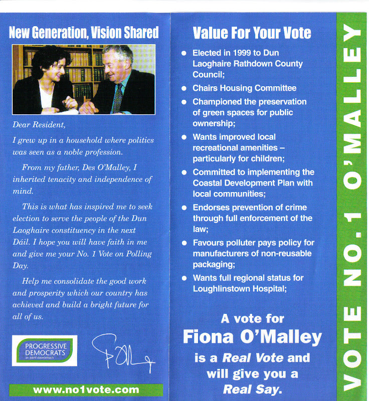 Fiona O’Malley, daughter of Dessie O’Malley, from her 2002 election campaign in Dun Laoghaire where she won a seat.