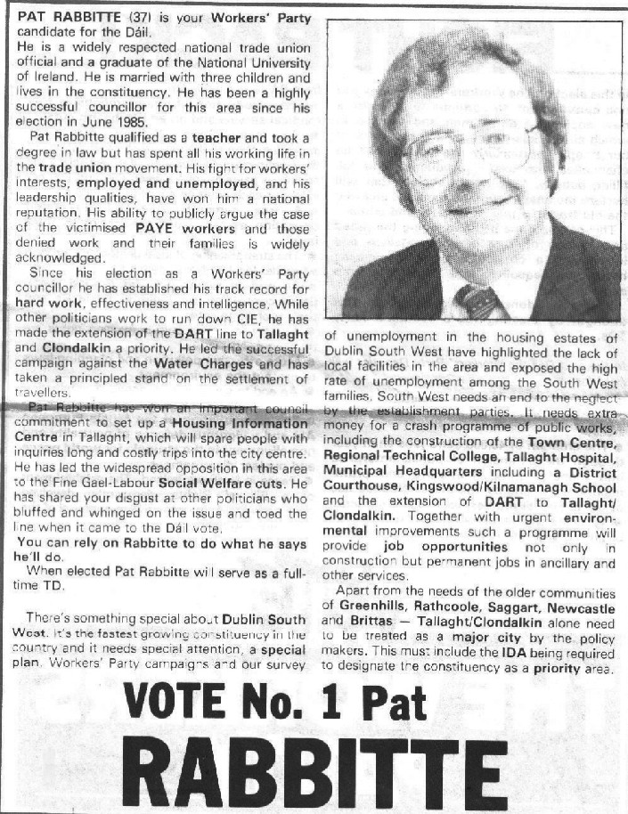 From the 1987 General election in Dublin South West. He mentions an awful lot that came to pass, such the the Hospital, Luas, Town Centre and so on. He polled 5,086 votes and failed to win a seat. He was elected in 1989 though.