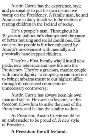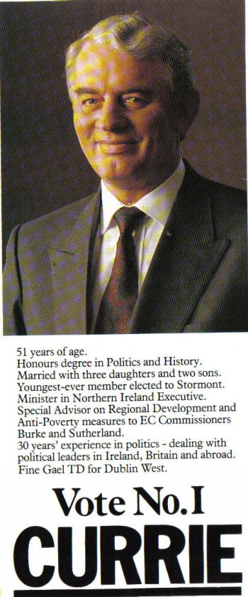 Austin Currie from the 1990 presidential election. Austin Currie, a candidate of some calibre, finished third behind Brian Lenihan and Mary Robinson. His poor showing was one of the factors of Alan Dukes demise as Fine Gael leader.