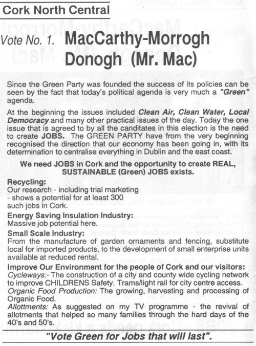 Donogh MacCarthy Morrogh (Mr Mac) – Green Party -Cork North Central 1992 » mccartmo92c
