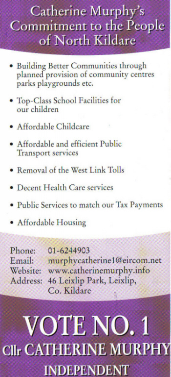 Former Workers Party, democratic Left and Labour Councillor Catherine Murphy (who has been very kind in sending her election literature over the years) from her successful by election campaign in 2005. This is just her flyer, I’ll put up more detailed stuff in due course. However it does show the pressures on North Kildare at the time such as school places and recreation facilities, indicating that a lot of the estates built were done so without adequate facilities.