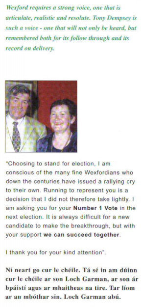 Former Wexford Hurling manager Tony Dempsey when he ran successfully in the 2002 General Election.