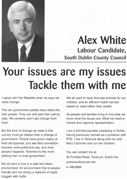 Alex White from the 2004 Local elections where he was elected for the Terenure-Rathfarnham ward. He has since been elected to the Seanad and stood twice for Labour in Dublin South.