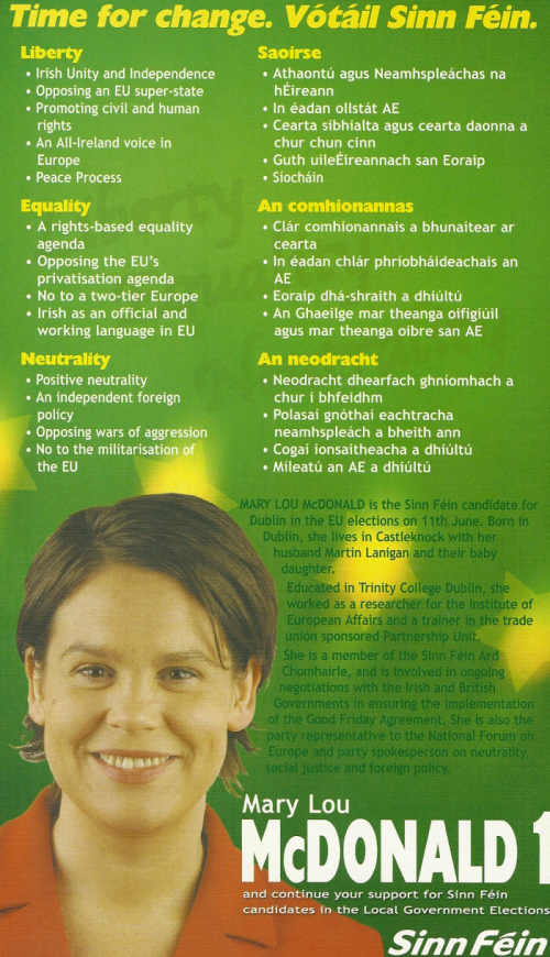 From the 2004 European Elections, a leaflet from Sinn Fein candidate Mary Lou McDonald, where she won a seat in Dublin.