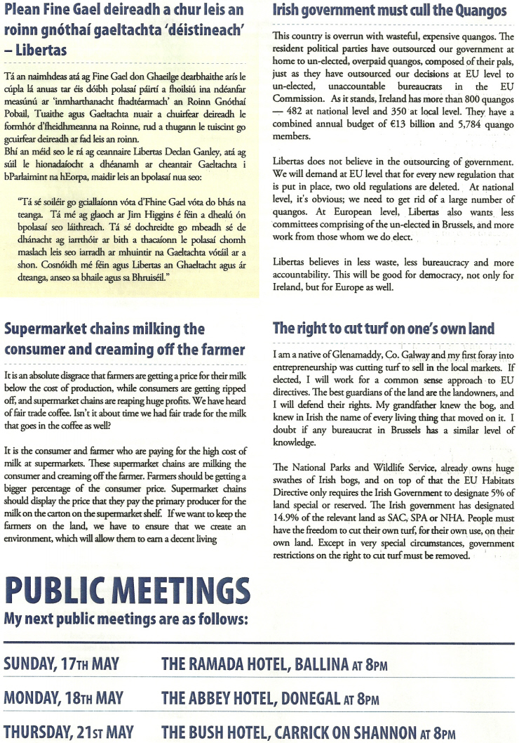 It shows how populist Libertas was. The issues covered were all simple, popular generalities such as ‘Cut Red Tape’, ‘job protection’, ‘turf cutting’, ‘culling quangos’and so on. It is simple and well produced and its hard to disagree with most of the sentiments involved.