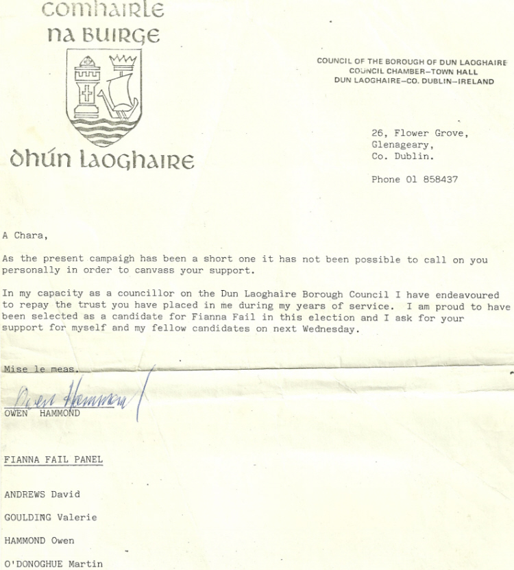 Owen Hammond Letter to the Electorate- Fianna Fail- November 1982 GE Dun Laoghaire » hammond82leta