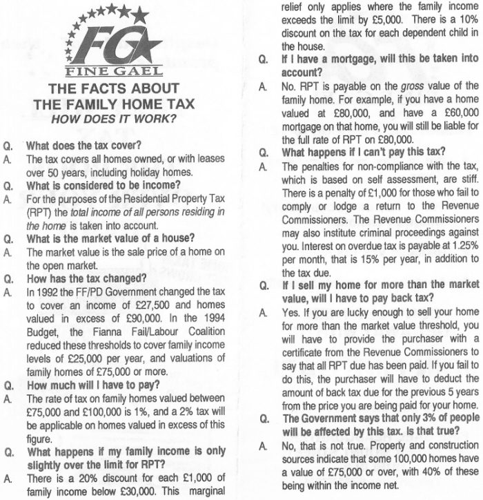 “They Will Tax the Roof over Your Head” -Fine Gael anti Property Tax Leaflet 1994 January 16, 2010