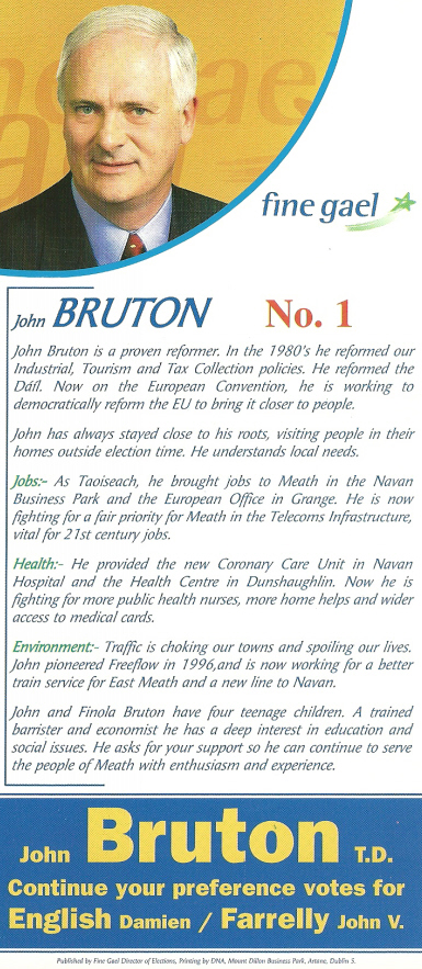 John Bruton stands for the last time in 2002 in Meath where he was elected on the 8th count. Former Taoiseach and Fine Gael Leader, Bruton resigned his seat to take up the role of EU Ambassador to Washington in 2004.