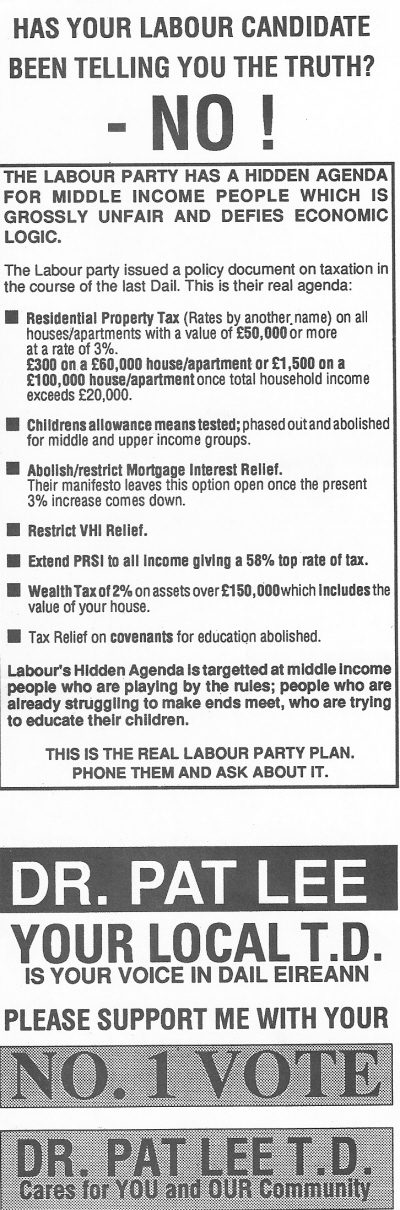 “Has your Labour Candidate been telling you the Truth?- NO!”-Dr Pat Lee -Fine Gael – 1992 Dublin NC » PatLee92