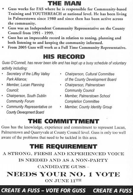 “Create a Fuss- Vote For Guss” -Guss O’Connell -Independent- Lucan 2004 LE » gusoc04b1