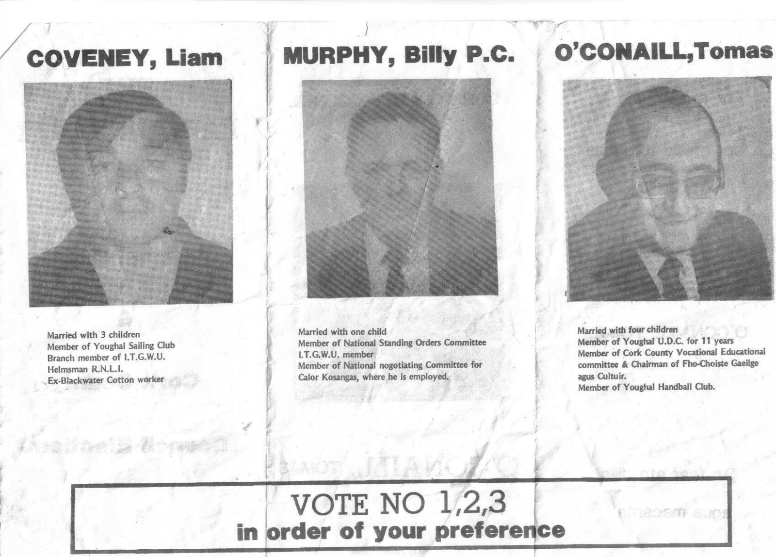 Not exactly the best quality leaflet, which wasn’t helped by the fact that I ‘rescued’ it from a ditch on the way to some haunted ruins on the banks of the Blackwater! I’m pretty sure its from the 1985 although I cant be certain. Tomas O’Conaill was running for Cork County Council where he polled 584 votes and failed to win a seat. He also ran for Youghal UDC whilst Liam Coveney and Billy Murphy were just running for the UDC. I’ve no idea who got in.