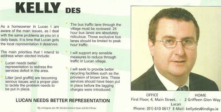 From the 2004 Local Elections in Lucan, a leaflet from Fianna Fail candidate Des Kelly.