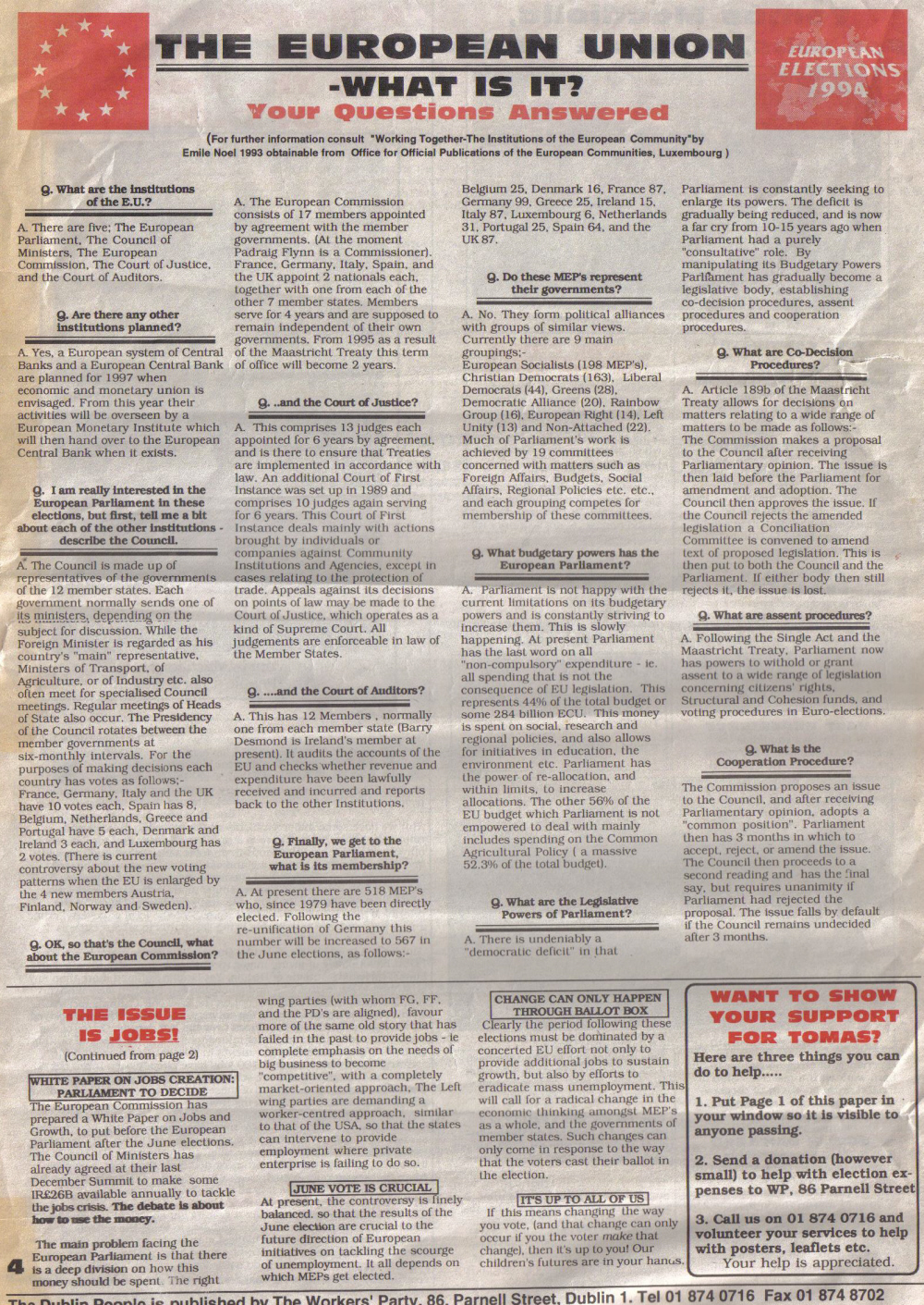 Tomás MacGiolla -‘Dublin People’ -Workers Party Paper- 1994 European Elections. » dp944c