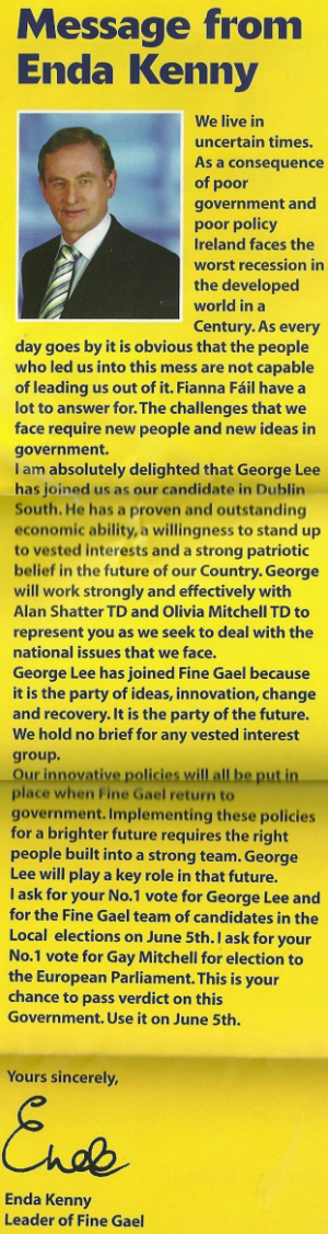 George Lee -Poster size leaflet (with great message from Enda)-Fine Gael 2009 Dublin South » georgeenda