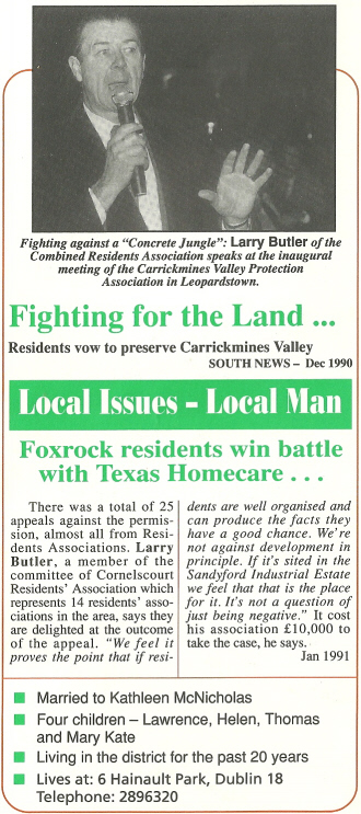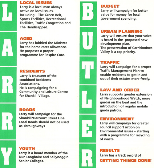 From the 1991 Local Elections in Glencullen, Fianna Fail candidate Larry Butler (the now Senator Larry Butler).