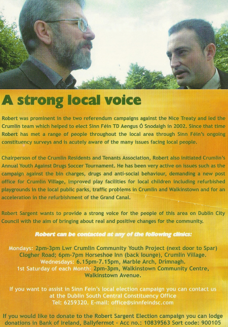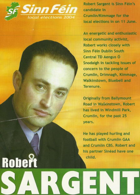 In 2004 Sinn Fein candidate Robert Sargent was easily elected to Dublin Corporation for the Crumlin Kimmage LEA. He polled over 3200 votes.