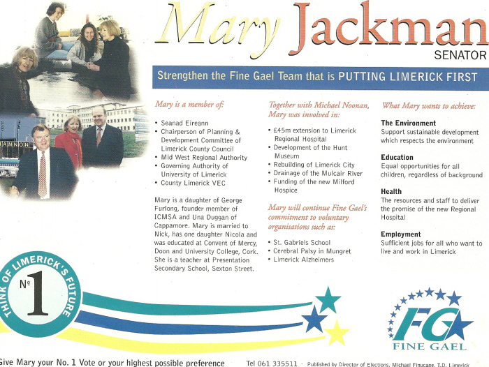From the 1998 Limerick East by-election ( won by Labours Jan O’Sullivan) the Fine Gael candidate, the then Senator Mary Jackman.