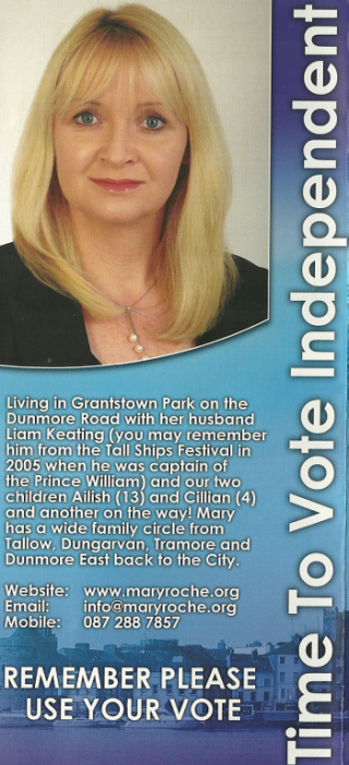 From the 2007 General Election, Independent Councillor Mary Roche in Waterford. A former Fianna Fail councillor, Mary Roche She resigned from FF in 2003 due to their failure to deliver on the 2002 Election promise regarding radiotherapy for Waterford.