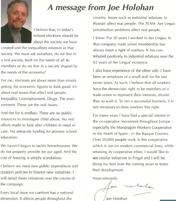 Joe Holohan polled just 225 votes coming in behind amongst others the Christian Solidarity Party.(result at electionsireland.org) The vote surely helped speed along the merger with the Labour party which happened less than a year later.