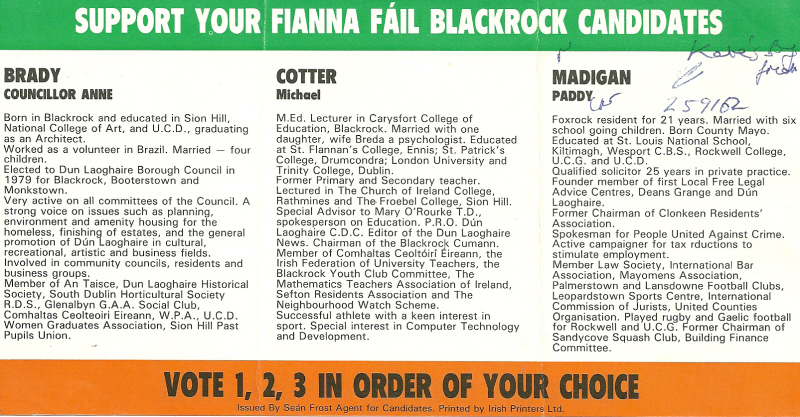 From the 1985 Local Elections, The Fianna Fail candidates for Blackrock Anne Brady, Michael Cotter and Paddy Madigan. As far as I’m aware Anne Brady and Paddy Madigan were elected. Paddy Madigan was elected again in 1991. He then fell out with Fianna Fail (or they fell out with him) somewhere along the way and ran as an Independent in the 1994 European Elections and the 1997 General Election.