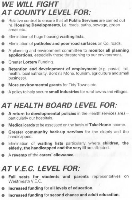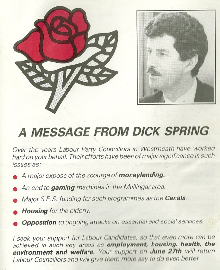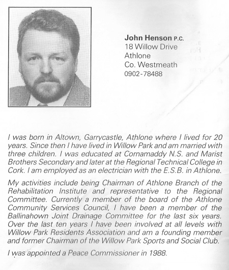 From the 1991 Local Elections in Athlone, Labour candidate John Henson. I’ve no idea if he was elected or not. Issues covered include moneylending and gaming machines in Mullingar.