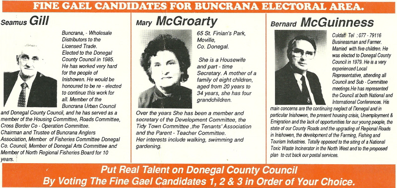 Seamus Gill , Mary McGroarty, Bernard McGuinness -Fine Gael -Buncrana 1991 LE » buncrana91a